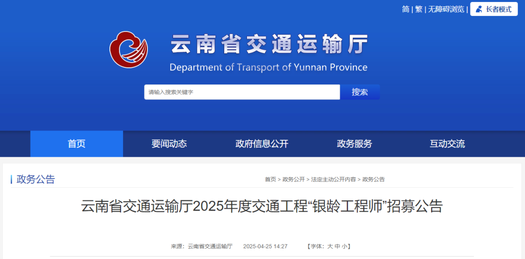 为推动云南省交通运输高质量发展,深入挖掘社会潜能,调动优秀退休工程师和一线退休专业技术人员继续投身交通运输事业的积极性,助力“优质工程、优质服务和绿色人文”交通建设,现就招募2025年度交通工程“银龄工程师”有关事项公告如下: