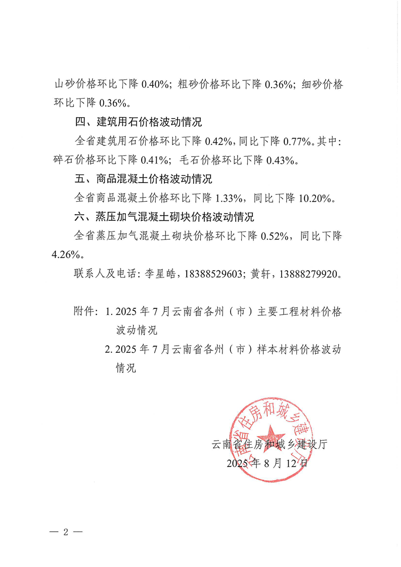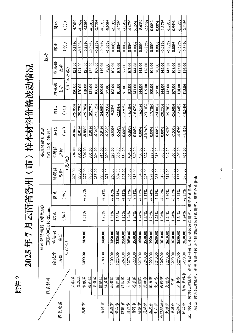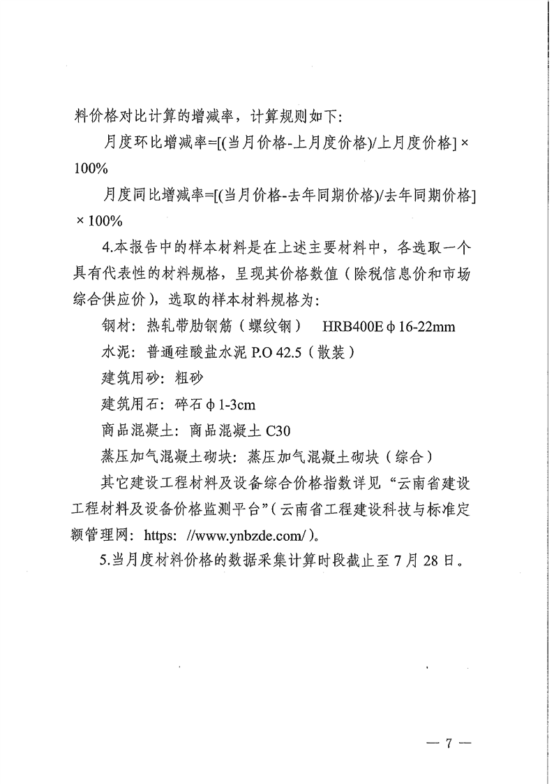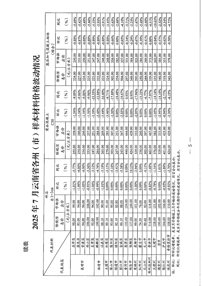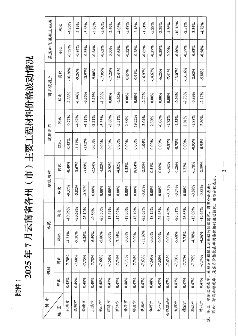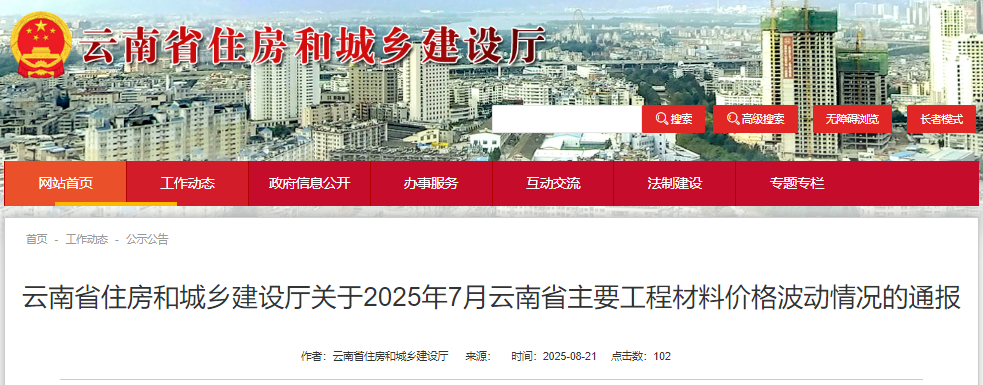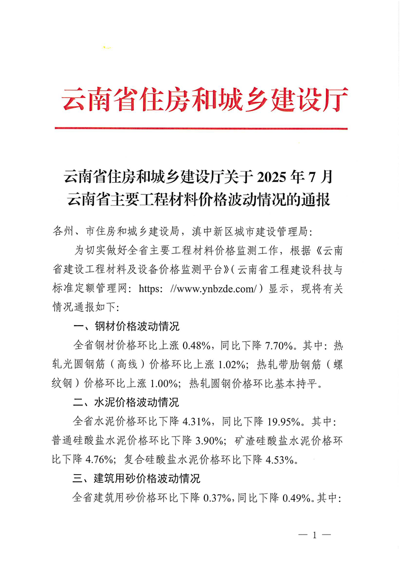 云南省住房和城乡建设厅关于2025年7月云南省主要工程材料价格波动情况的通报