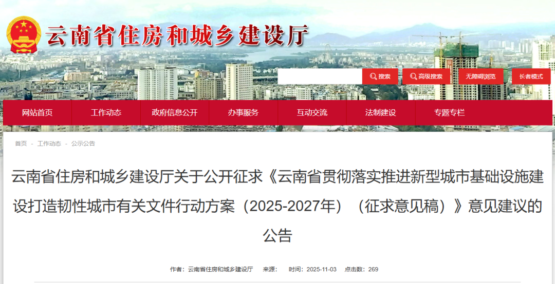 云南省住房和城乡建设厅关于公开征求《云南省贯彻落实推进新型城市基础设施建设打造韧性城市有关文件行动方案(2025-2027年)(征求意见稿)》意见建议的公告