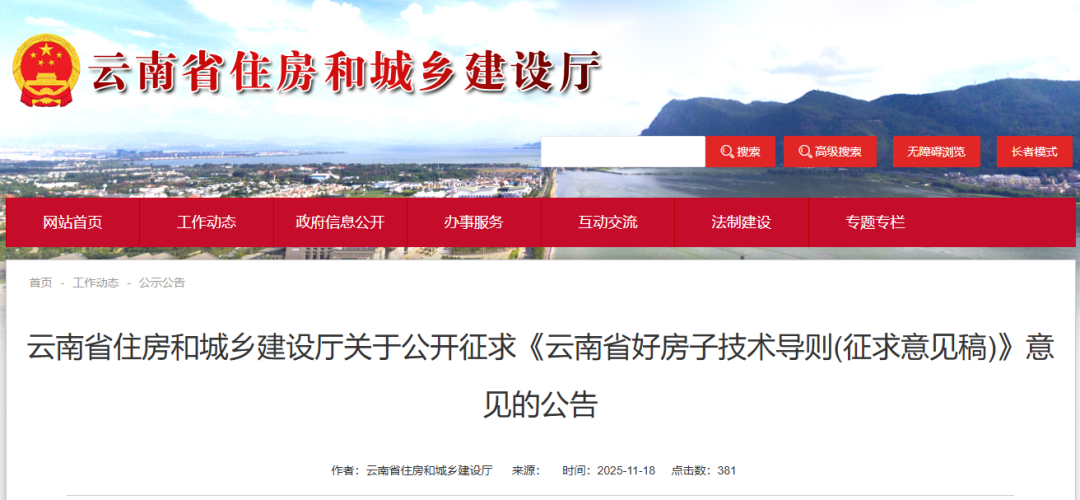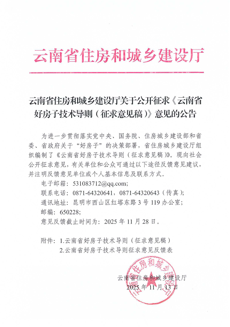 云南省住房和城乡建设厅关于公开征求《云南省好房子技术导则(征求意见稿)》意见的公告