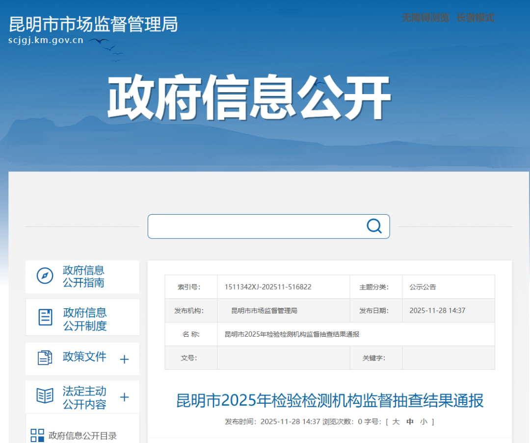 为进一步加强检验检测市场监管、规范检验检测行为,持续推进检验检测行风建设,根据全省2025年检验检测机构“双随机、一公开”监督抽查要求,昆明市市场监管局、昆明市公安局、昆明市生态环境局认真组织,已完成监督抽查工作。现将有关情况通报如下。