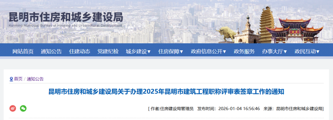 昆明市住房和城乡建设局关于办理2025年昆明市建筑工程职称评审表签章工作的通知