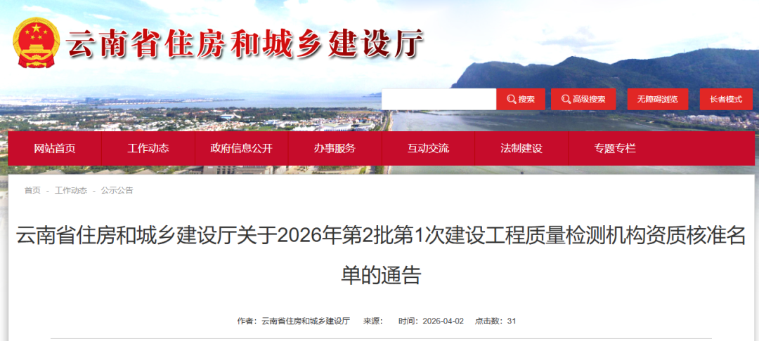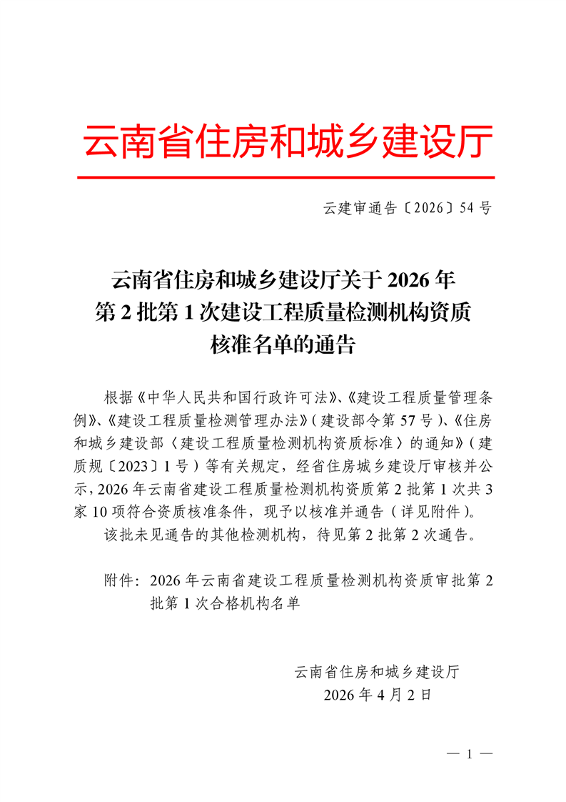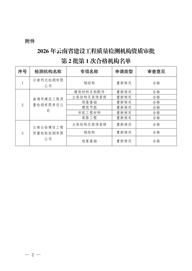 云南省住房和城乡建设厅关于2026年第2批第1次建设工程质量检测机构资质核准名单的通告