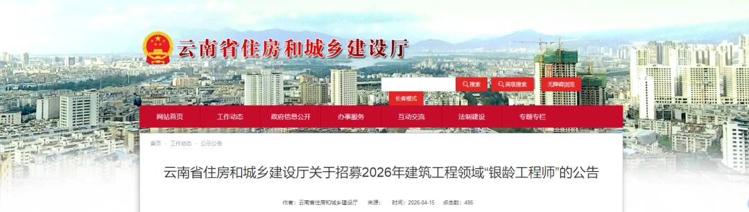 为深入学习贯彻习近平总书记关于做好新时代人才工作的重要思想和关于住房城乡建设、老龄工作的重要指示批示精神,锚定“3815”战略发展目标,吸引“银龄人才”投身云南省住房城乡建设事业,充实人才队伍,促进旅居云南建设,现就2026年招募“银龄工程师”支持建筑工程领域发展有关事项公告如下: