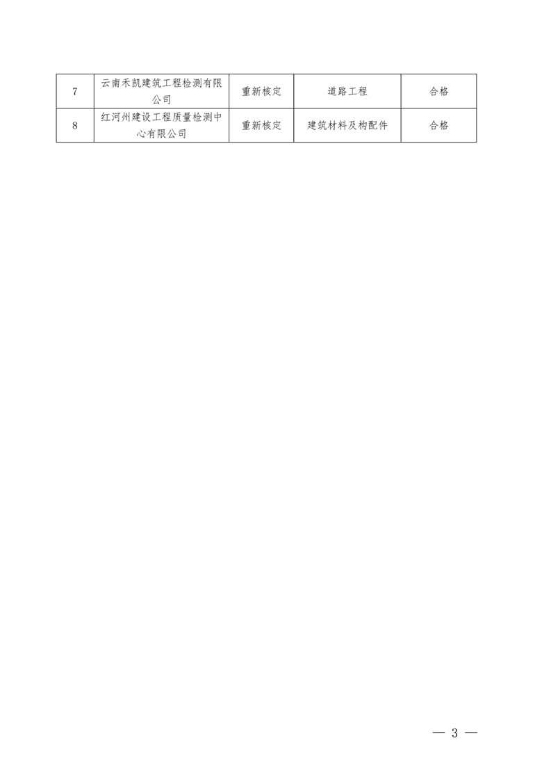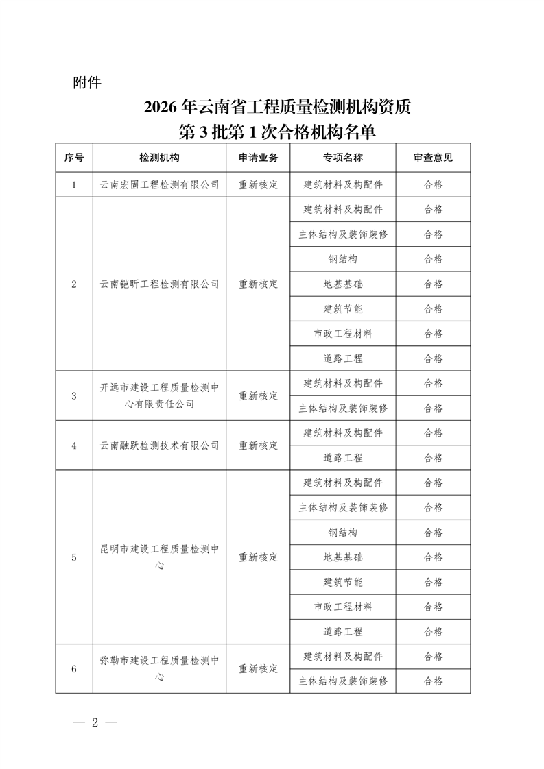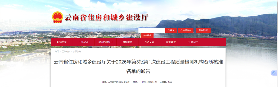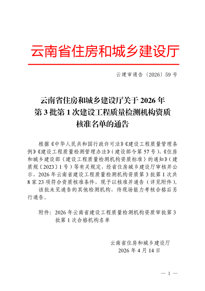 云南省住房和城乡建设厅关于2026年第3批第1次建设工程质量检测机构资质核准名单的通告